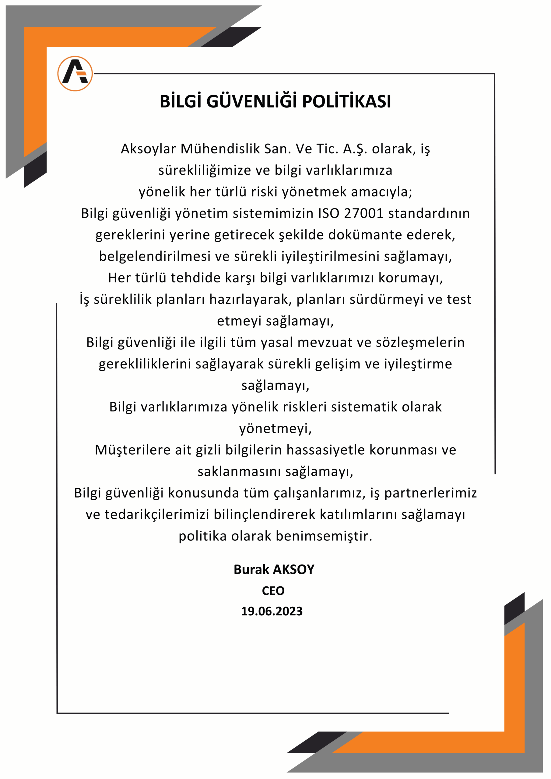 Aksoylar Mühendislik olarak çalışmalarımızda iş sürekliliğine ve bilgi varlıklarının güvenliğine yönelik tüm riskleri yönetmeyi hedefleyerek. ISO 27001 standartlarını temel aldığımız bilgi güvenliği yönetim sistemimizi sürekli olarak iyileştiriyoruz. Ayrıca, tüm tehditlere karşı bilgi varlıklarımızı korumak için gerekli önlemleri alıyor ve iş süreklilik planları hazırlayarak, bunların sürdürülmesini ve düzenli olarak test edilmesini sağlıyoruz.