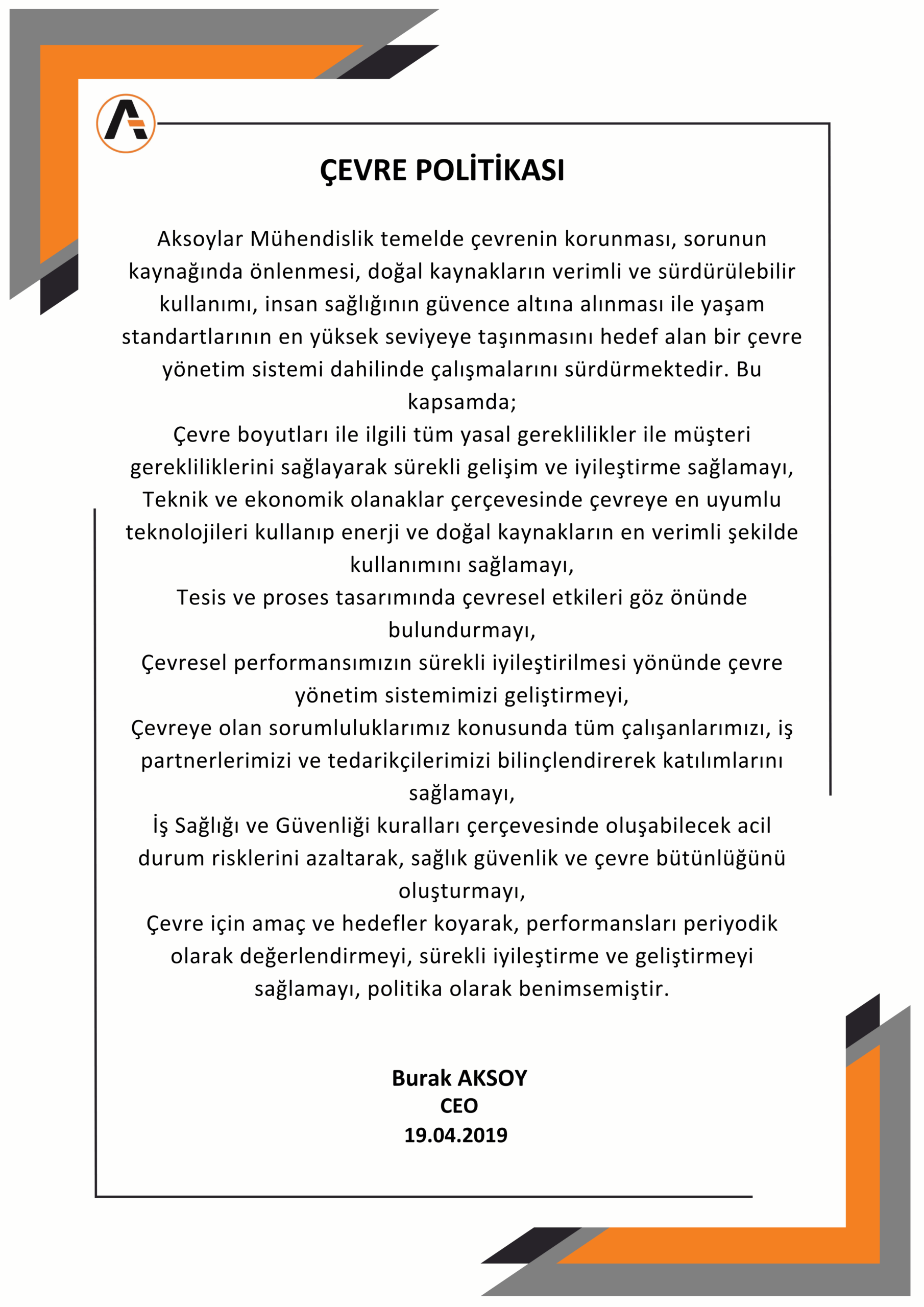 Aksoylar Mühendislik olarak çevrenin korunması, sorunun kaynağında önlenmesi, doğal kaynakların verimli ve sürdürülebilir kullanımı, insan sağlığının güvence altına alınması ve yaşam standartlarının en yüksek seviyeye taşınması hedefiyle bir çevre yönetim sistemi içinde çalışmalarımızı sürdürüyoruz.