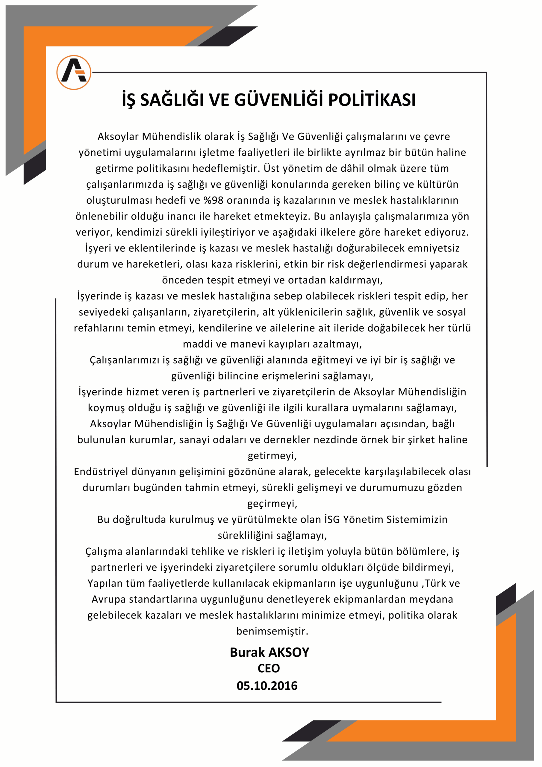 Aksoylar Mühendislik olarak iş sağlığı ve güvenliğini işletme faaliyetlerimizin ayrılmaz bir parçası olarak kabul ediyor. Tüm çalışanlarımızda, üst yönetim dahil, iş sağlığı ve güvenliği bilinci ve kültürünü oluşturmayı hedefleyerek iş kazalarının ve meslek hastalıklarının %98’inin önlenebilir olduğuna inanarak hareket ediyoruz. Bu doğrultuda çalışmalarımızı yönlendirerek, sürekli kendimizi geliştiriyor ve iş sağlığı ve güvenliği politikamızda yer alan ilkelerimize uygun olarak hareket ediyoruz.