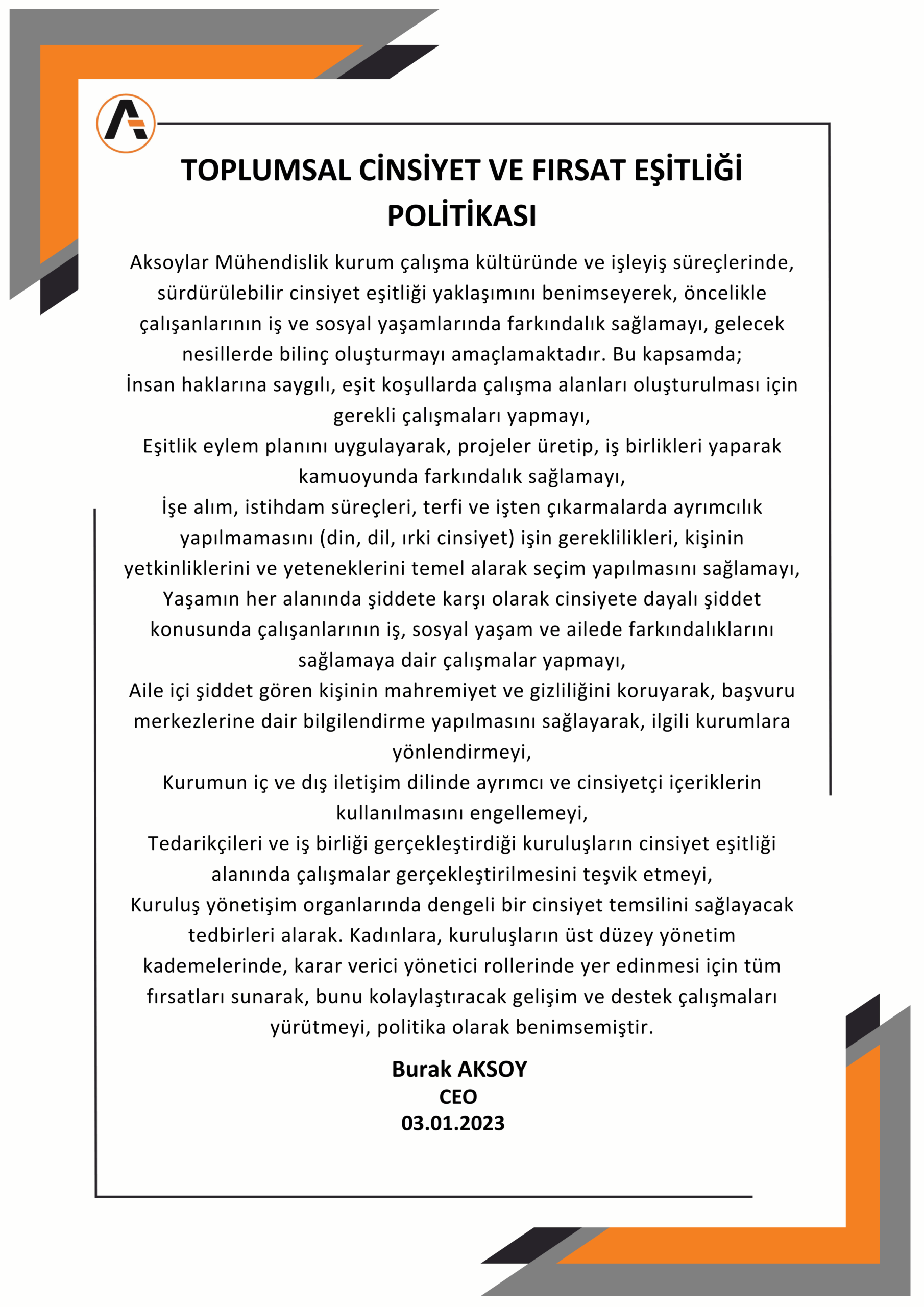 Aksoylar Mühendislik, kurumsal çalışma kültüründe ve işleyiş süreçlerinde sürdürülebilir cinsiyet eşitliği yaklaşımını benimseyerek, öncelikle çalışanlarının iş ve sosyal yaşamlarında farkındalık oluşturmayı ve gelecek nesillerde bilinç oluşturmayı amaçlamaktadır. Bu kapsamda, cinsiyet ayrımcılığına karşı sıfır tolerans politikası benimseyerek eşit fırsatlar ve haklar sağlamayı, kadınların iş yaşamında güçlenmesini desteklemeyi ve liderlik rollerinde daha fazla temsilini teşvik etmeyi hedeflemektedir.